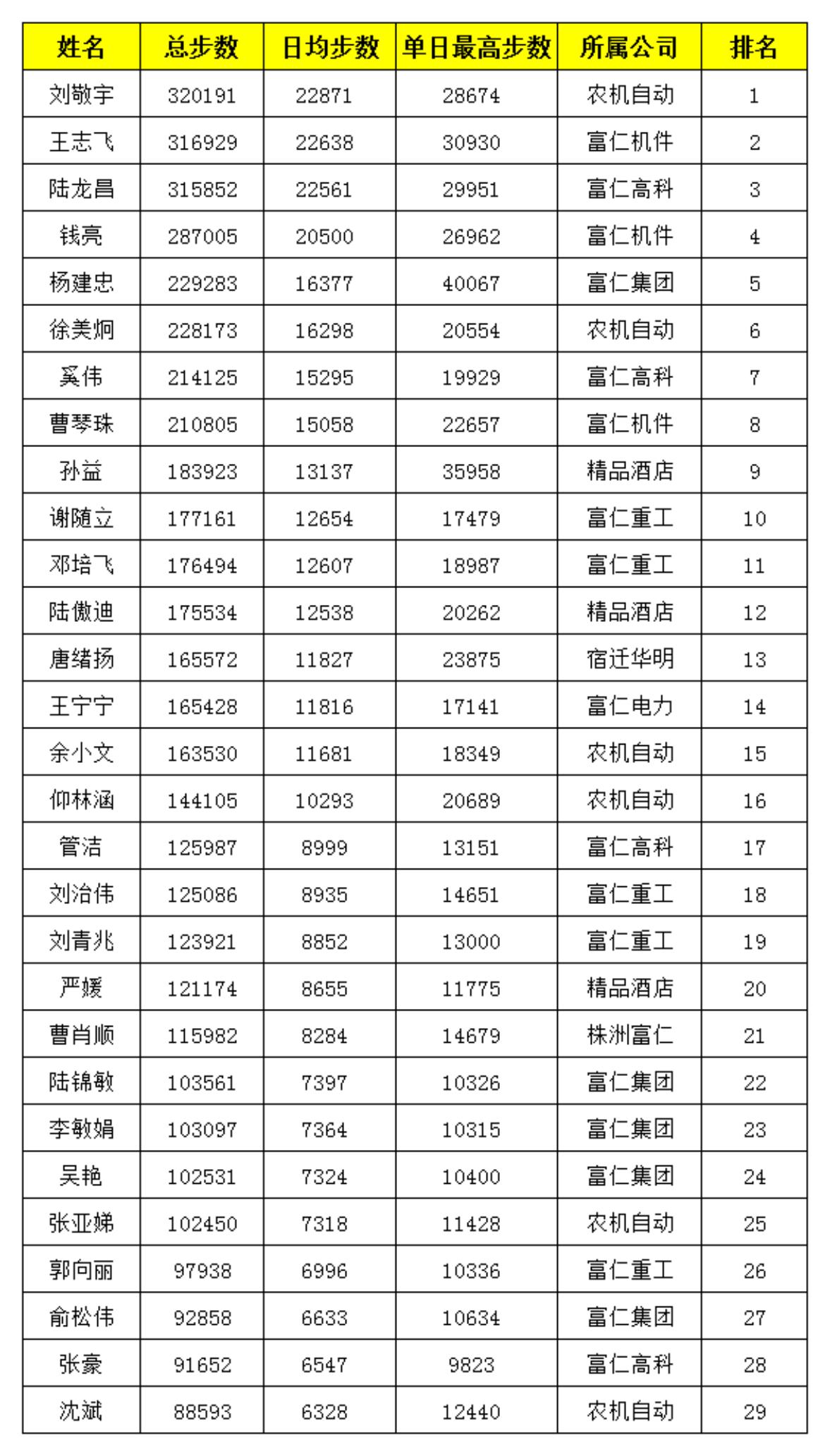 生命在於運動,運動使人健康。在抗擊新冠疫情的大背景下,富仁集團9月以運動健身為主題,鼓勵員工每天進行體育鍛煉,增強身體素質,通過微信運動步數每日打卡的形式,於9月13日—26日,開展了為期14天的線上打卡活動。微信運動打卡活動已於昨日落下帷幕,據最終統計,此次活動共收到打卡條目數逾千條,集團及域內、域外各子公司員工積極響應,踴躍參與,近百名職工參與了此次活動。14天的運動打卡說難不難,說簡單也不容易,有不少員工雖然參與了活動但卻未能最終堅持下來。每天5000步的運動門檻對有些人來說比較困難,但是對於“運動達人”們來說卻易如反掌,日均2萬+,單日最高3萬+,4萬+的運動量比比皆是。讓我們一起看看最終的獲獎成績吧!