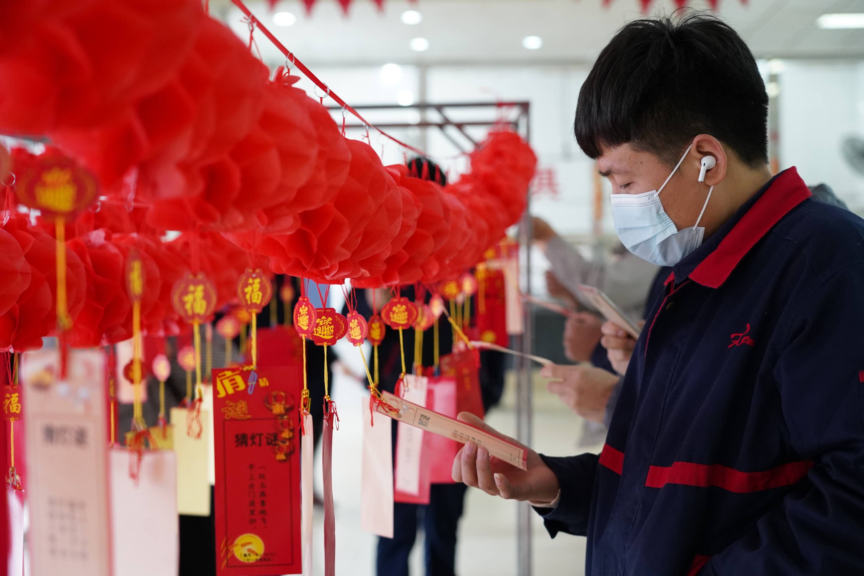 員工食堂張燈結彩,節日氛圍喜慶熱鬧。大家穿梭在喜慶的紅色燈籠下,仔細甄別謎麵,參與答題,活動現場熱鬧非凡。今年除了線下猜燈謎活動,還通過微信開展了線上猜燈謎活動,員工們閑暇時就能戳戳手機,在線猜燈謎,贏好禮,獎品送不停。近400人參與了線上猜謎活動,也贏取了豐富的獎品。