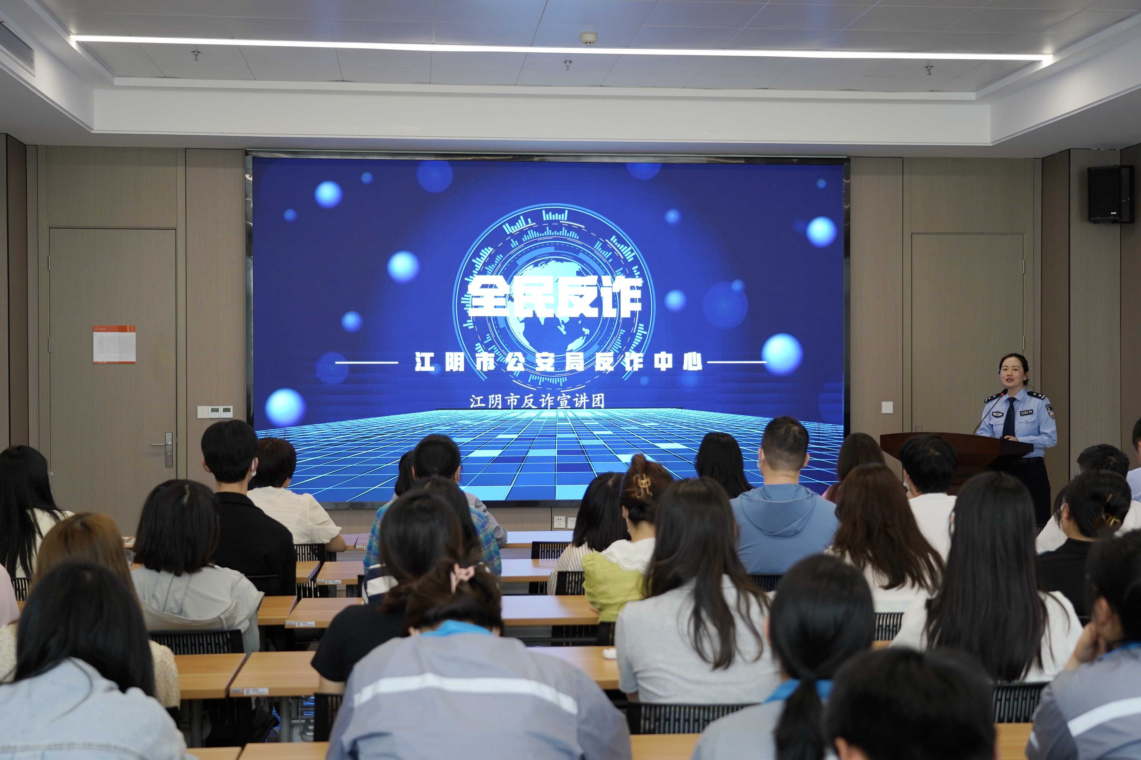 近jin年nian來lai,各ge種zhong騙pian術shu層ceng出chu不bu窮qiong,給gei企qi業ye和he個ge人ren帶dai來lai了le巨ju大da的de損sun失shi。為wei了le提ti高gao企qi業ye員yuan工gong對dui於yu詐zha騙pian的de防fang範fan意yi識shi和he應ying對dui能neng力li,保bao障zhang公gong司si和he個ge人ren的de財cai產chan安an全quan,5月16日下午,富仁集團聯合江陰市反詐宣講團在集團科技大樓一樓培訓室開展了“警企共建,全民反詐”為主題的宣傳培訓活動,集團各子公司代表50餘人參加了本次活動。