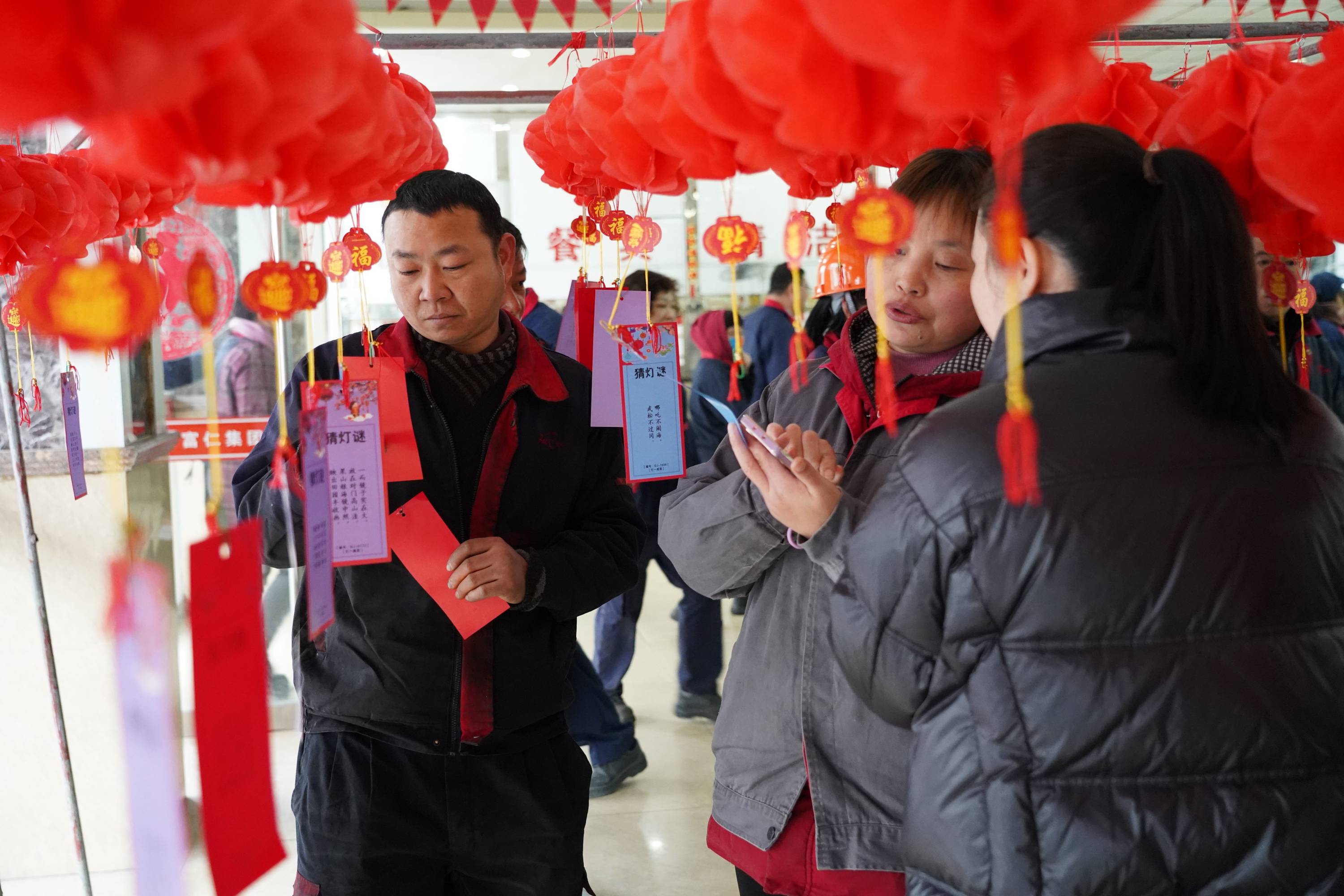 員工食堂張燈結彩,節日氛圍喜慶熱鬧。大家穿梭在喜慶的紅色燈籠下,仔細甄別謎麵,參與答題,活動現場熱鬧非凡。今年除了線下猜燈謎活動,還通過微信開展了線上猜燈謎活動,員工們閑暇時就能戳戳手機,在線猜燈謎,贏好禮,獎品送不停。近400人參與了線上猜謎活動,也贏取了豐富的獎品。