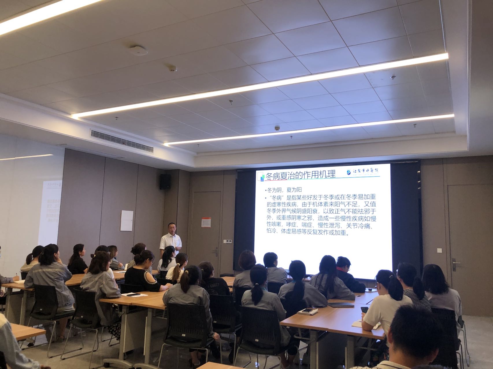 講座上,鍾主任生動詳細地向富仁員工解釋了何謂體質、體質的特點、影響體質的因素和九種體質的具體特點及調理方式。在講解中,使大家對中醫體質有了初步的認識。隨後,為大家講解《夏季三伏貼保健》,從什麼是養生、夏季養生方法及中醫養生方法三個方麵向大家介紹了三伏貼的養生方法。在整個講解的過程中,大家認真聽講、積極互動,課堂氛圍十分歡快愉悅。