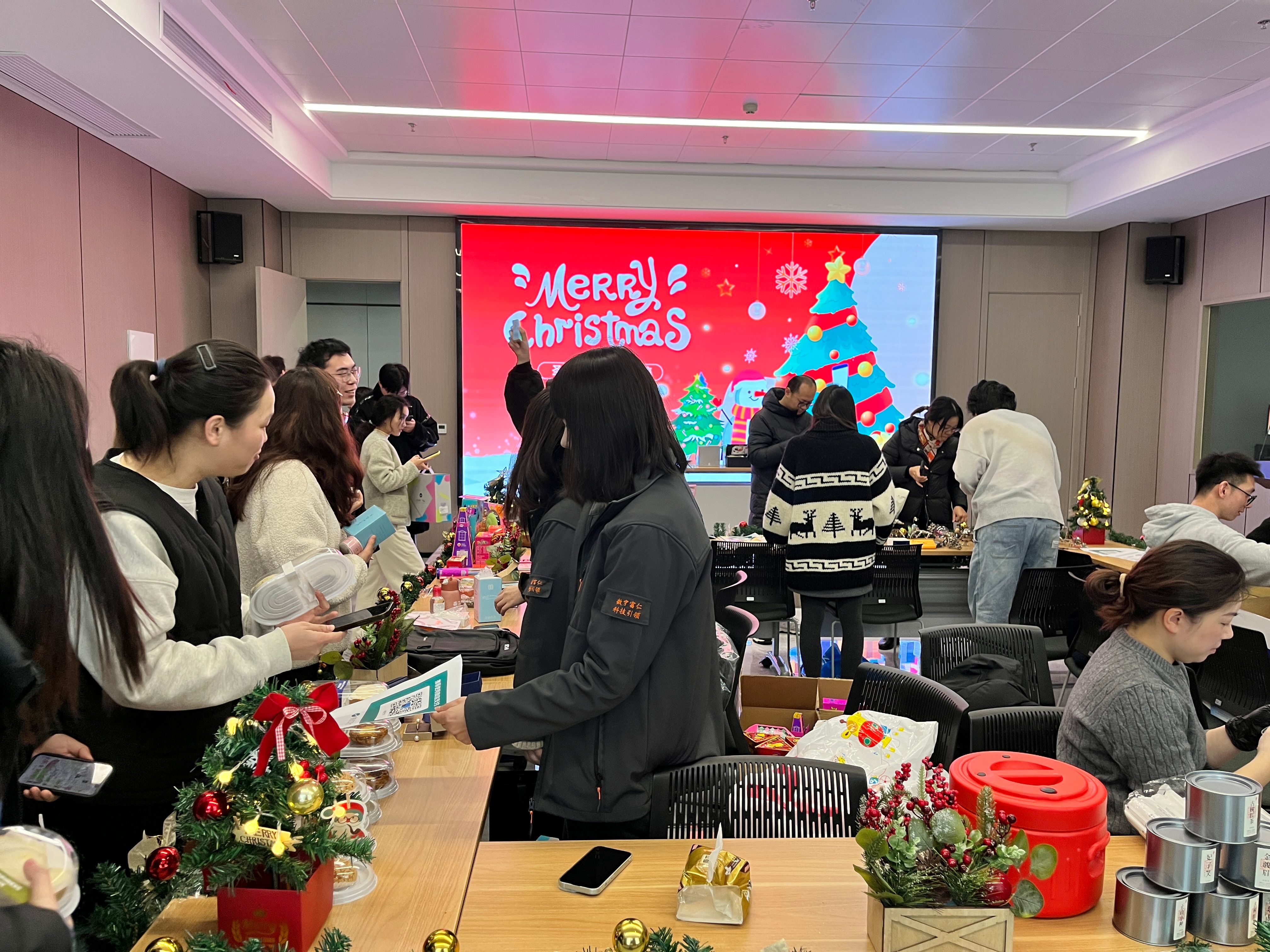 上(shang)午(wu)十(shi)點(dian),活(huo)動(dong)現(xian)場(chang)準(zhun)備(bei)就(jiu)緒(xu),十(shi)個(ge)攤(tan)位(wei)在(zai)聖(sheng)誕(dan)裝(zhuang)飾(shi)的(de)烘(hong)托(tuo)下(xia)顯(xian)得(de)有(you)序(xu)而(er)又(you)溫(wen)馨(xin),歡(huan)快(kuai)的(de)聖(sheng)誕(dan)音(yin)樂(le)在(zai)室(shi)內(nei)回(hui)響(xiang),為(wei)整(zheng)個(ge)活(huo)動(dong)現(xian)場(chang)注(zhu)入(ru)了(le)無(wu)限(xian)的(de)活(huo)力(li)。