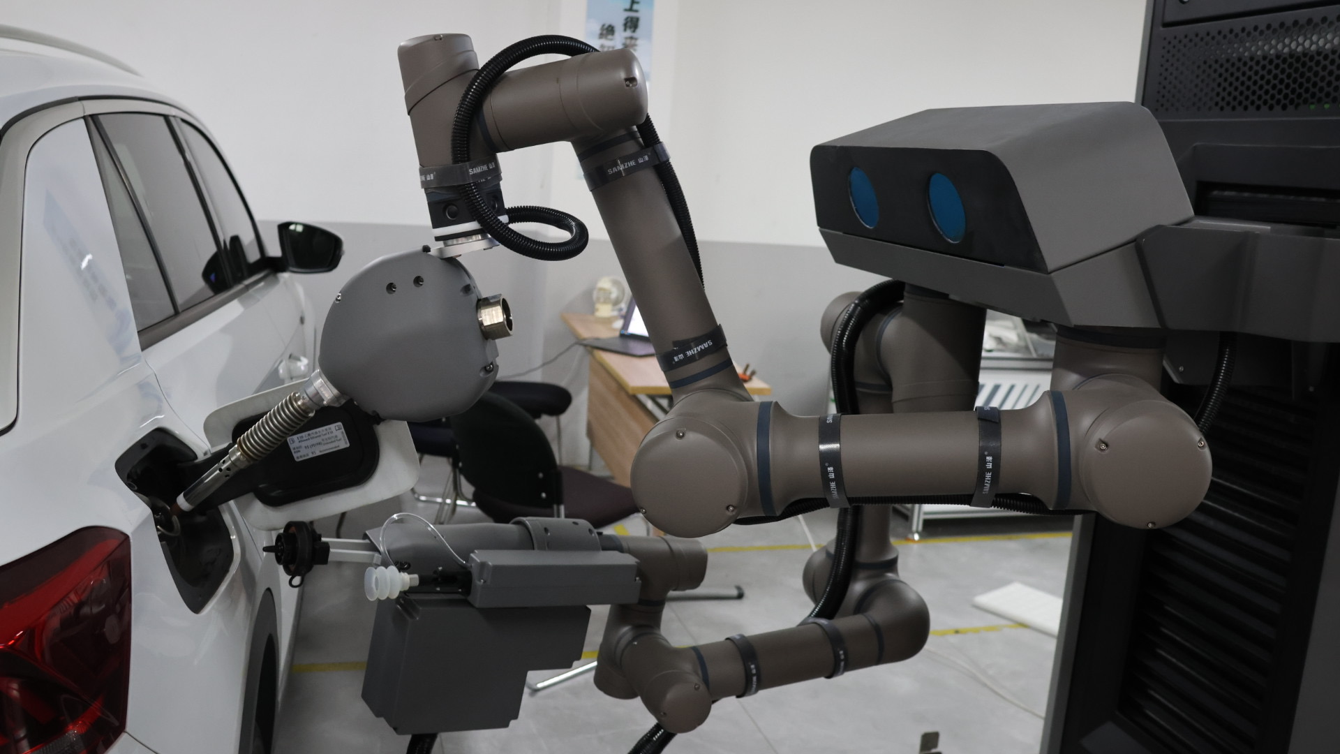 此外第三代雙臂加油機器人還具備幾個技術亮點:擁有動態監控與預警功能,可以實時監測設備狀態,異常情況自動報警,保障安全;擁有雲端遠程管控功能,支持多設備集中調度,油品數據與交易記錄一鍵導出,助力數字化管理;一體式集成設計,模塊化雙臂協同作業,柔性油槍降低操作風險,適配現有加油站改造。