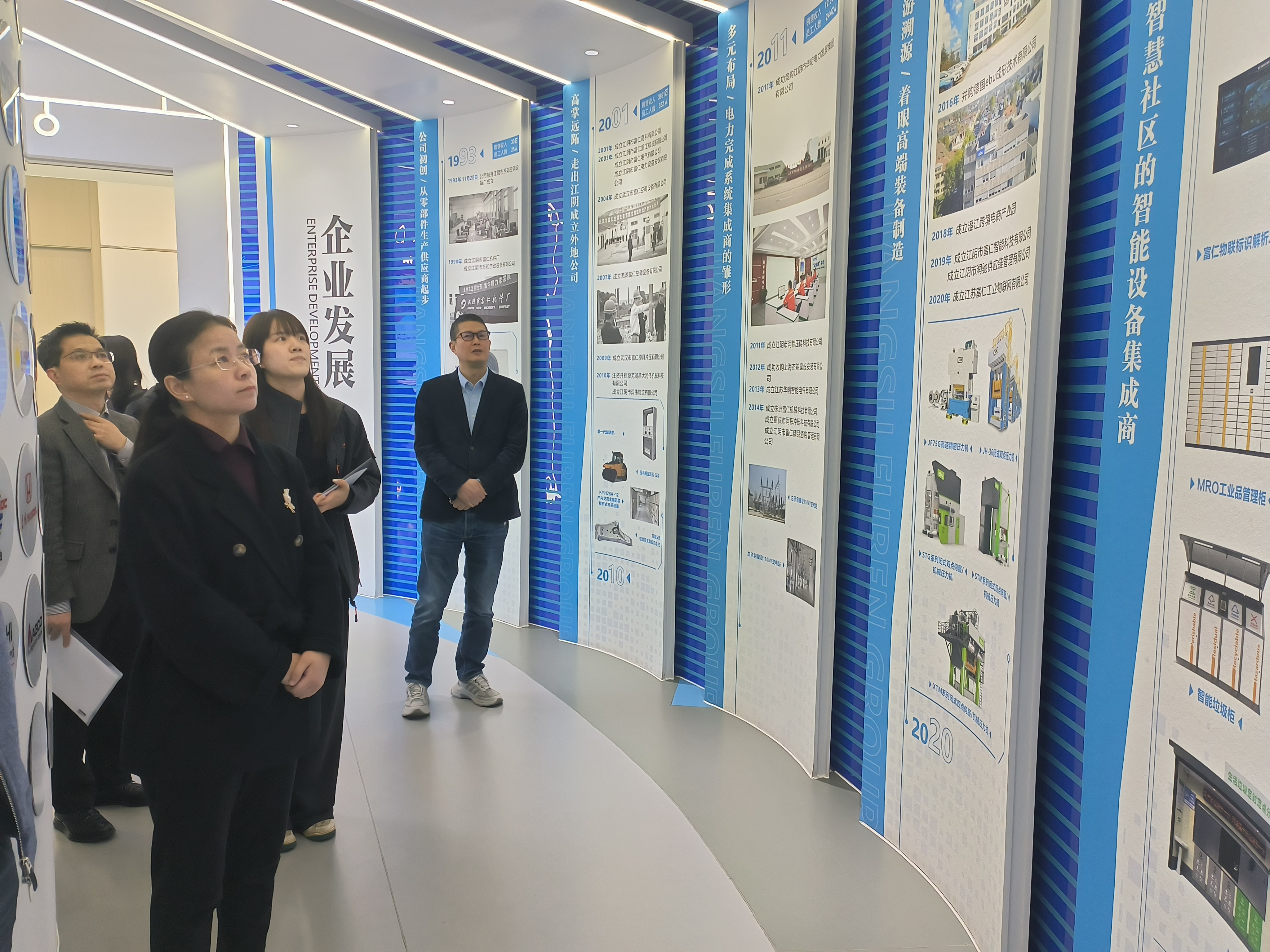 調研伊始,吳莉萍書記一行走進富仁集團企業展廳,通過圖文展示、實物陳列與技術演示,詳細了解企業三十多年發展曆程、四大業務板塊布局及核心技術成果。從傳統製造到智能製造的轉型軌跡,從儲能係統到AI機器人的創新產品,全方位展現了富仁集團以科技為核的發展理念,得到來訪領導的充分肯定。